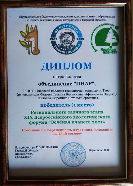 Студенческий театр прически и боди-арта «Пиар» стал победителем Регионального заочного этапа XIX Всероссийского экологического форума «Зеленая планета 2021» в номинации «Современность и традиция. Близкий далекий космос», представив коллекцию «Космические леди», посвященную празднованию 60-летия полета Ю.А.Гагарина в космос.