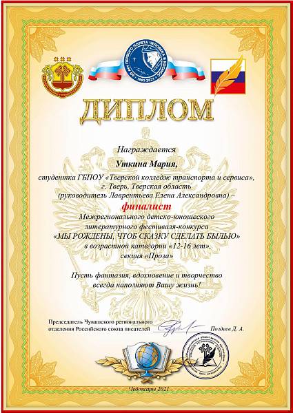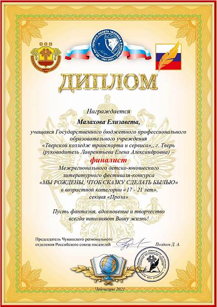 В ноябре-декабре 2021 года студенты группы 2ГД2 (Графический дизайн) приняли участие в Межрегиональном детско-юношеском литературном фестивале-конкурсе «Мы рождены, чтоб сказку сделать былью» с произведениями собственного сочинения в номинации «Проза». По итогам фестиваля-конкурса обе студентки получили рецензии на свои произведения и стали финалистками. Поздравляем!!!