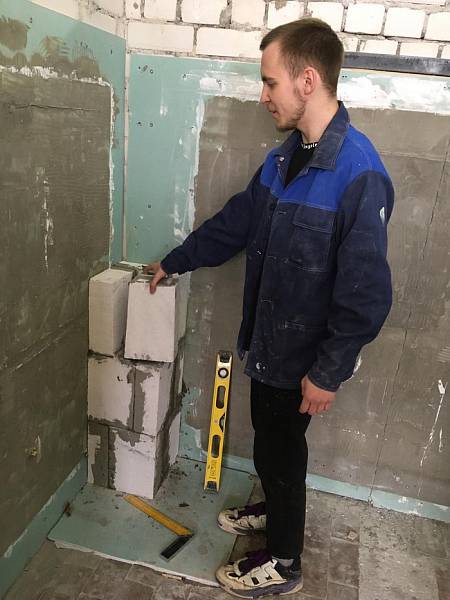 Участники по компетенции Облицовка плиткой оттачивают свое мастерство в мастерских колледжа.