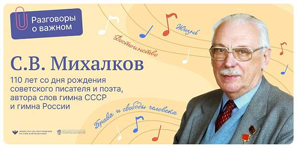 13 марта 2023 года занятия из цикла «Разговоры о важном» были посвящены теме «110 лет со дня рождения советского писателя и поэта, автора слов гимна СССР и Гимна России С. В. Михалкова». Занятия были направлены на расширение, обобщение и закрепление знаний обучающихся о творчестве С. В. Михалкова; формирование представлений о многогранности его личности; знакомство с историей создания Государственного гимна СССР и Государственного гимна Российской Федерации. Занятия по традиции начались с выноса флага РФ и исполнения государственного гимна.