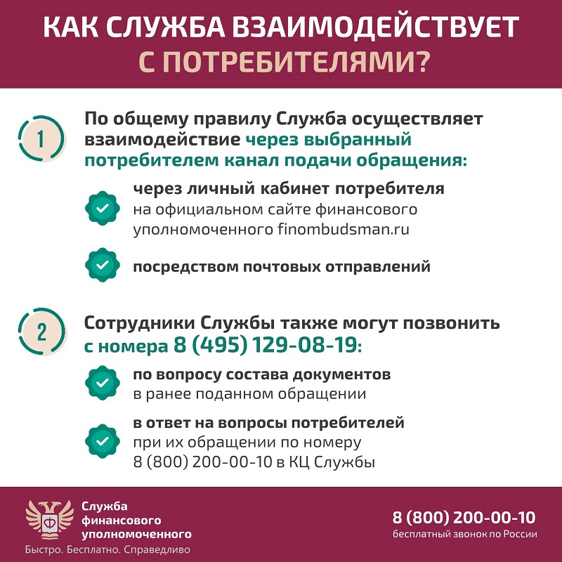 Напомним, что Служба финансового уполномоченного взаимодействует с потребителями финансовых услуг лишь в том случае, если потребитель подал обращение к финансовому уполномоченному или обращался с вопросом в контактный центр Службы. Вместе с тем рассмотрение финансовым уполномоченным обращений потребителей бесплатно по закону. Официальный сайт Службы финансового уполномоченного finombudsman.ru